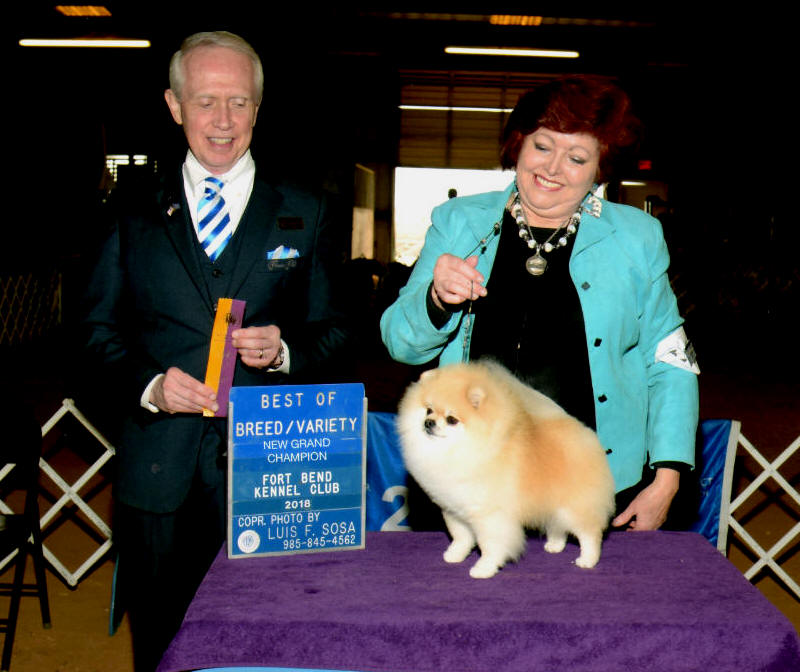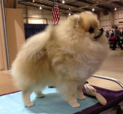 Lee is a handsome cream sable who completed his Championship with 3 majors. Lee has a beautiful correct coat, is up on leg, short backed, sound moving, with a great tail set, beautiful head and great pigment. Lee completed his Grand Championship with two 5 point Best of Breed wins at Ft Bend Kennel Club, the last one awarded by Pom expert Fred Bassett.