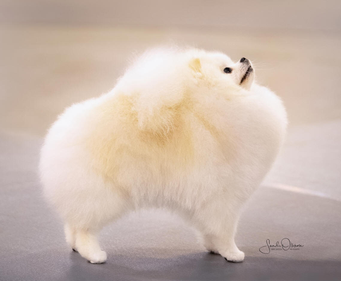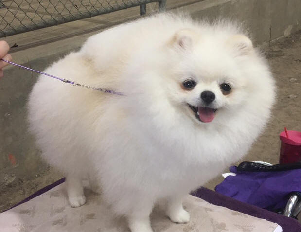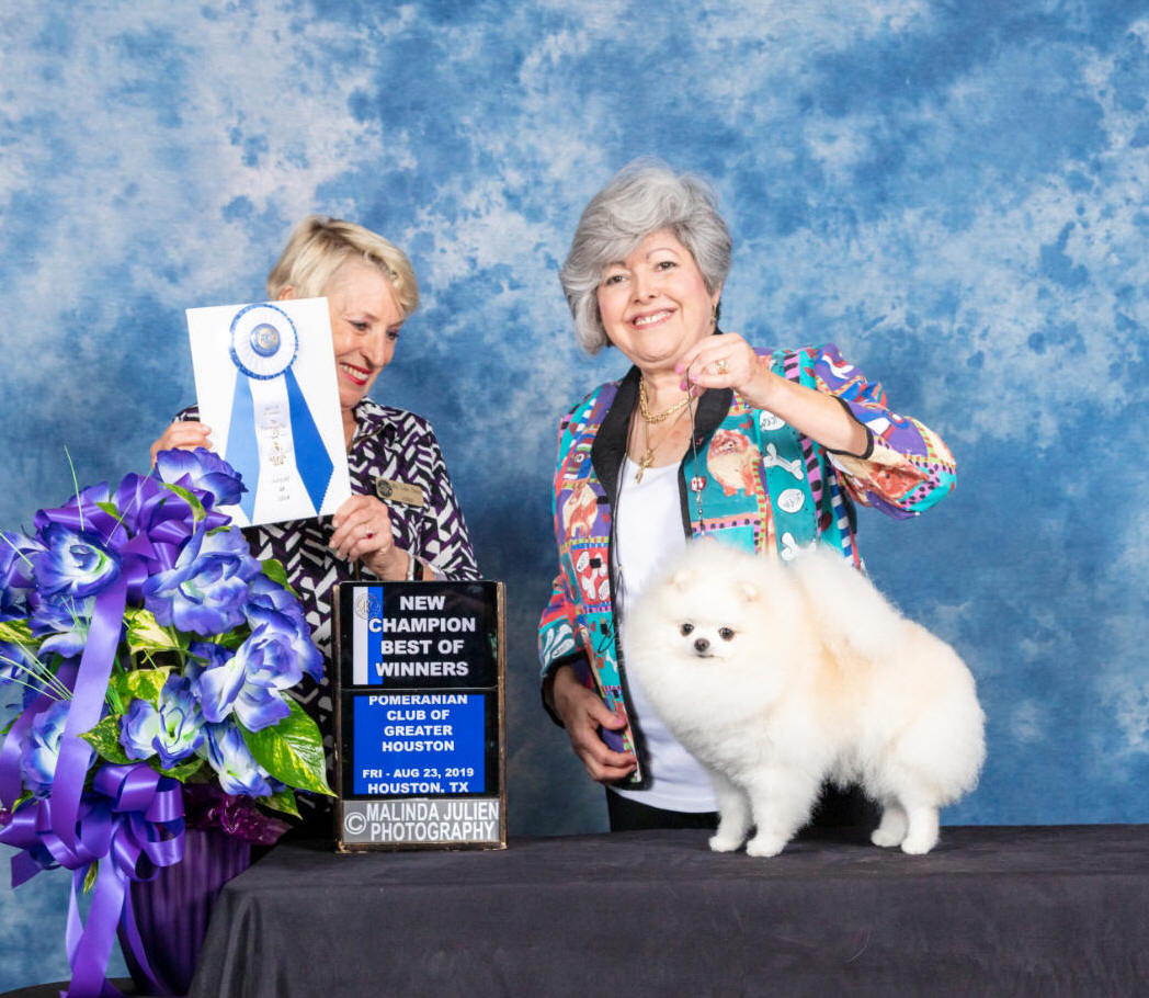 Our lovely Pris has matured beautifully! She free whelped her first litter of 3 girls 12-10-18. She was back in gorgeous condition July 2019 winning one major and a RWB at the competitive Reliant shows competing against her beautiful daughter Serafina, CH RobCary's Silver Angel. Pris completed her Championship winning BW for a 5 point major at the Houston Pom Club (2) show August 2019. Her daughter won the major at the first Pom Specialty that day and Pris was RWB! We plan to breed Pris to our handsome, young, white male, Yomi in December.