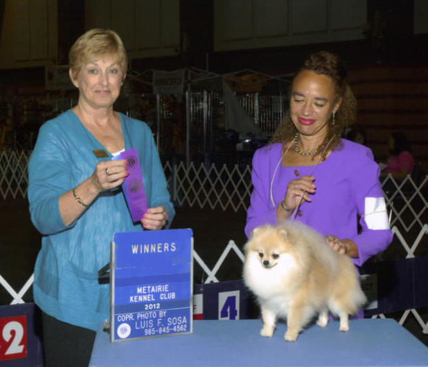Selena was sold as a puppy to Linda Pelz of Dreamweaver’s Poms. Selena completed her Championship quickly as a puppy and produced several nice puppies for Linda. When Linda needed to downsize her dog numbers I was able to purchase Selena. She has just had a lovely litter of two cream boys and a cream girl sired by our handsome Lee. We plan to breed her one more time and then retire her to a wonderful pet home.