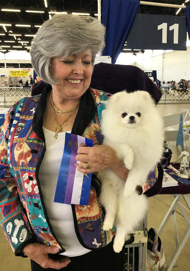 Karin Byrne and I were fortunate to purchase and co-own this beautiful white male at the March 2019 Nationals. In very limited owner/handled showing he has 6 points and 3 major reserves as well as 2 O/H Group 1s and a O/H Reserve BIS! Yomi has so many lovely qualities to add to our breeding programs including, beautiful structure and movement, correct head a beautiful face, good bite, small ears, good ear set, nice tail set and wonderful personality! He may be a little slow to mature but we expect great things from this special boy! His first son, a beautiful little cream was born here 08/19/2019. He is an extremely promising little boy! Karin is expecting puppies sired by Yomi in November. Yomi will be permanently with me in Texas effective December 2019.